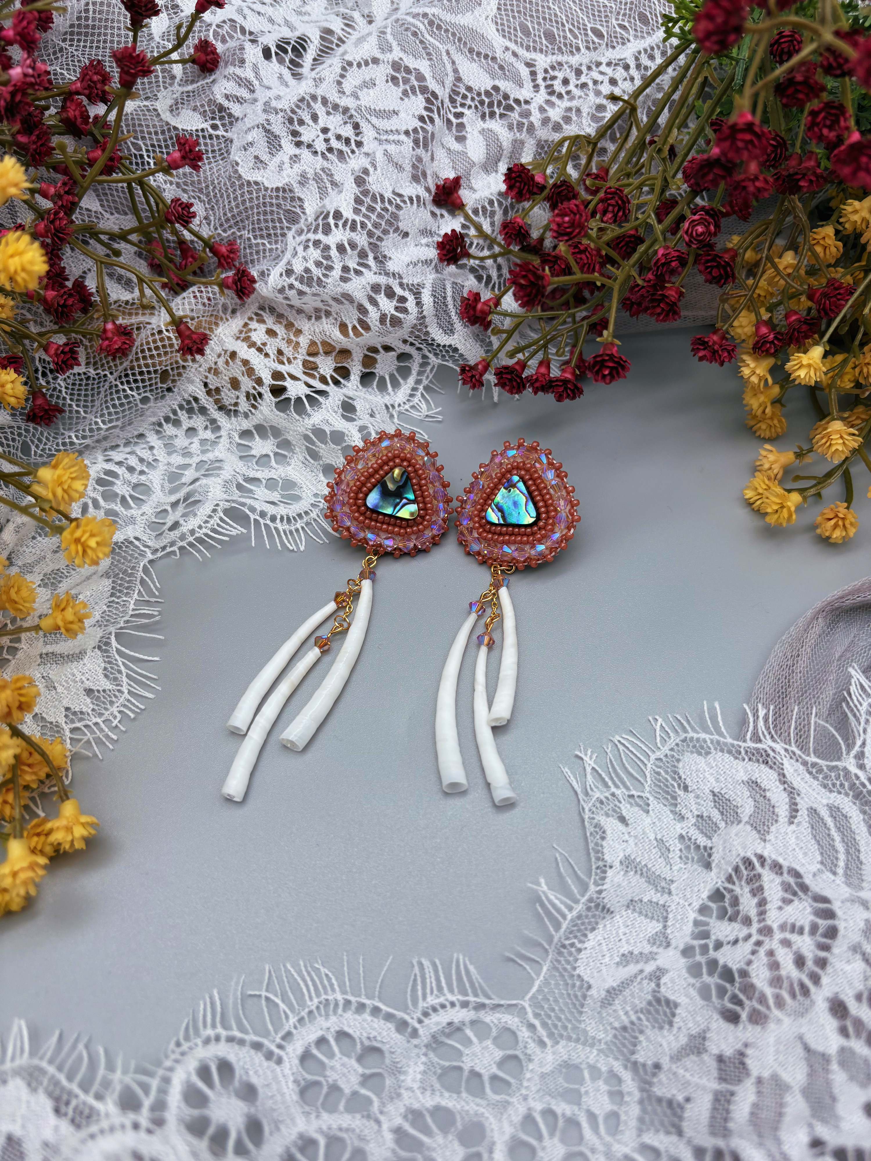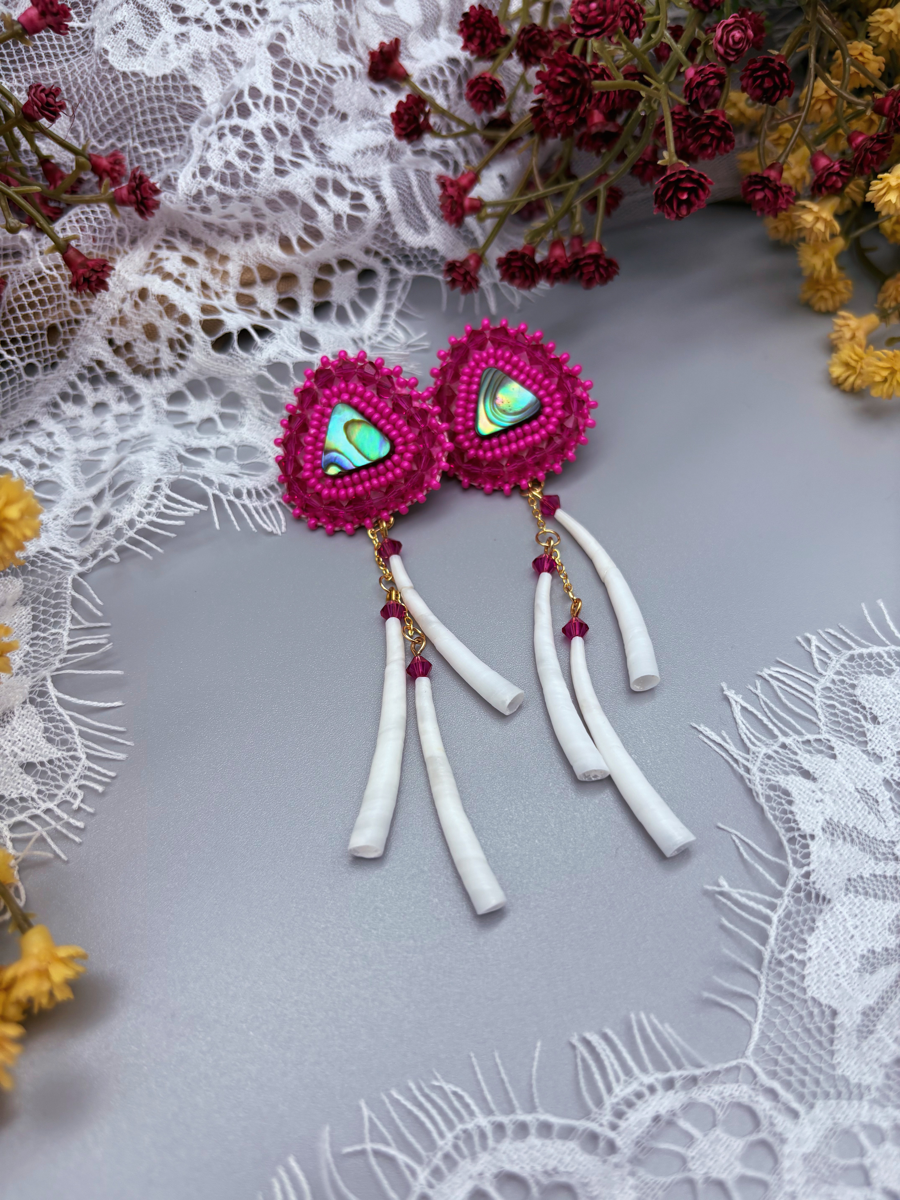 abalone triangle center, swarovski or preciosa bicone crystal beads, and cascading dentalium chains! Various colors to choose from, pick below! All on posts!