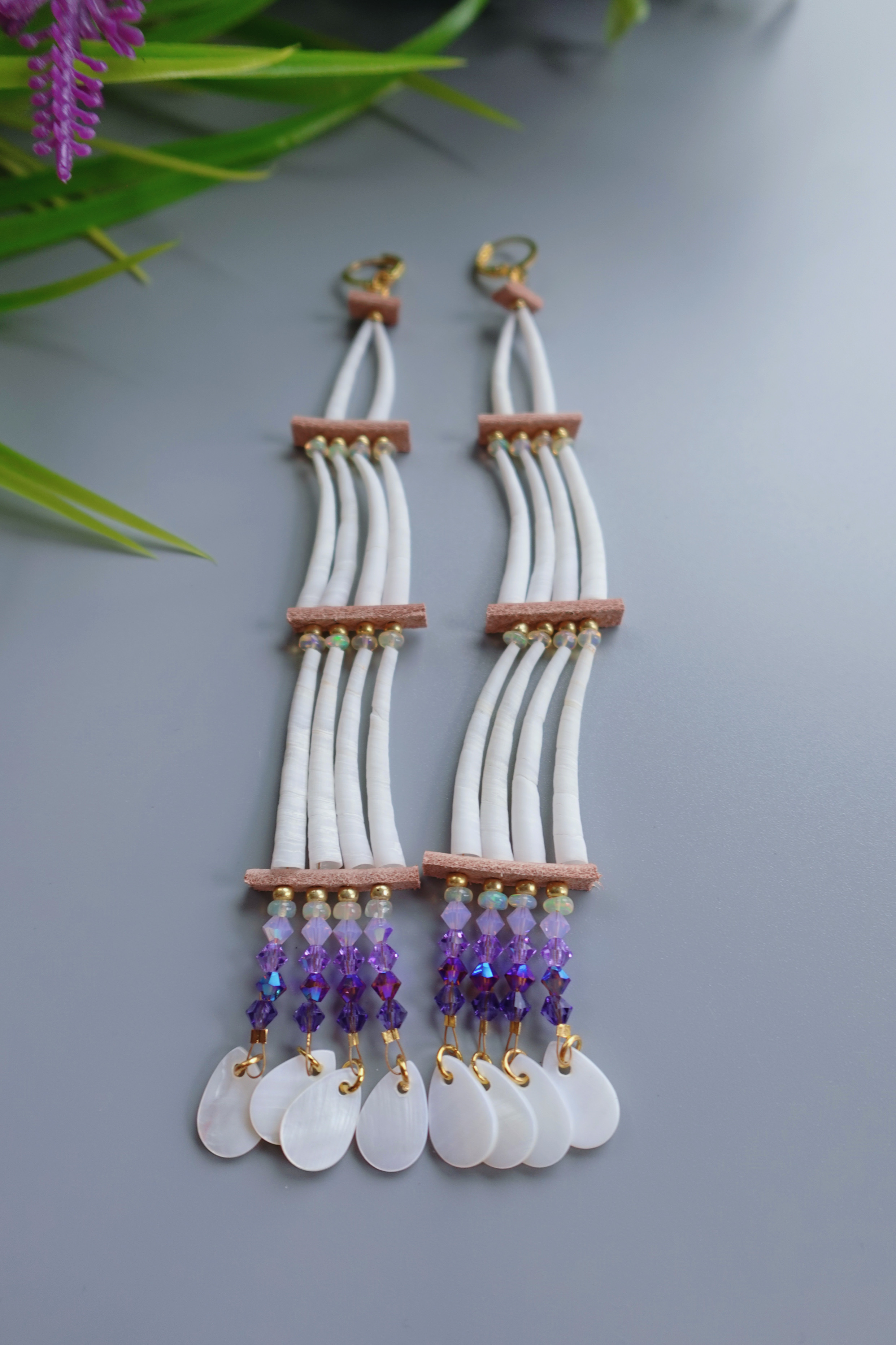 Three-tier t’u’tas (dentalium) drops with abalone and gold findings! These earrings are made with medium to large dentalium shells, hand-made tan deer lace spacers, various purple AB crystal bicone beads, genuine ehtiopian opal, and small Mother of Pearl shell coins at the bottom. They measure approximately 6.5 inches from top to bottom!